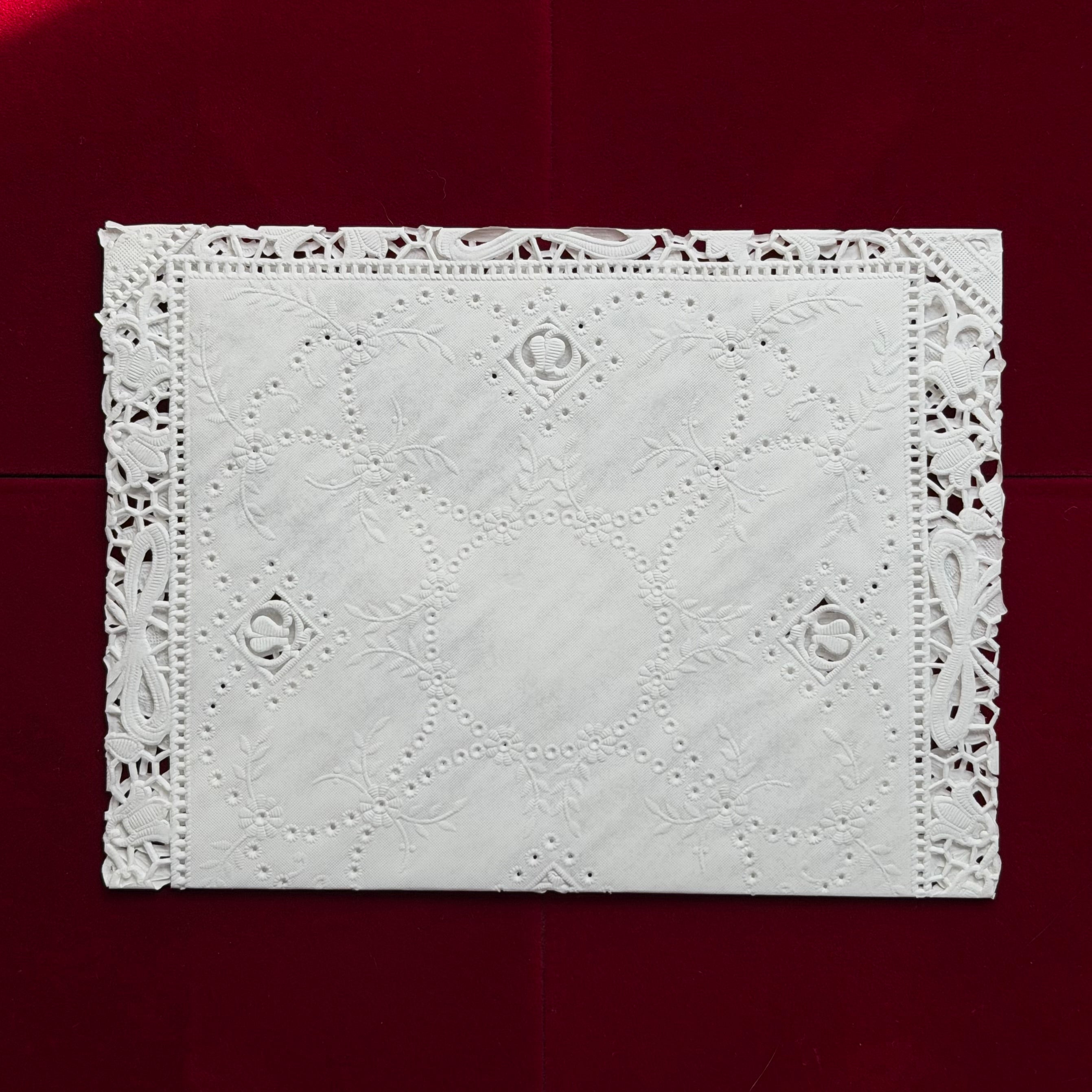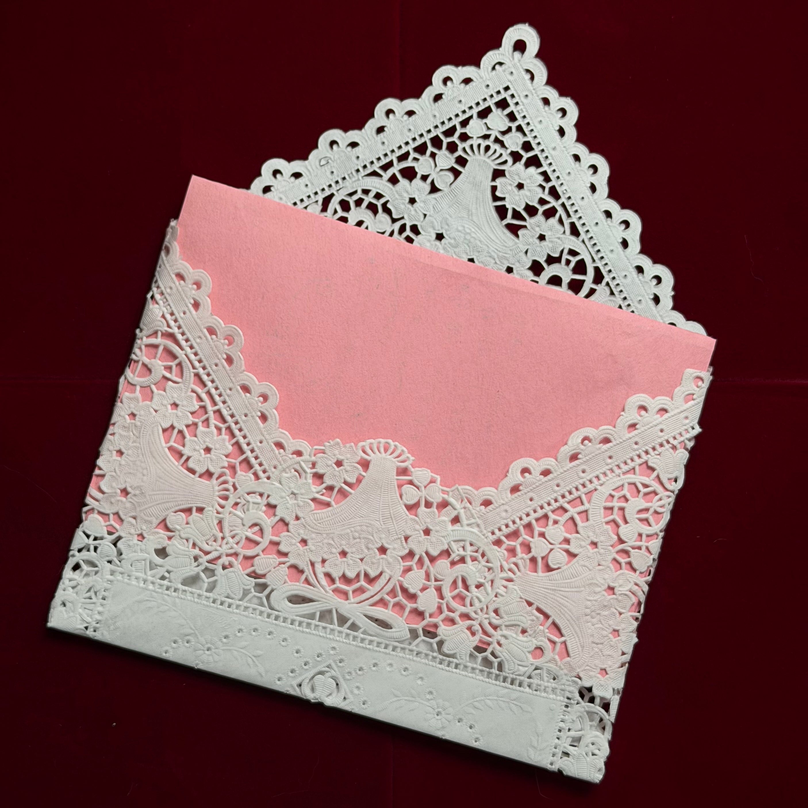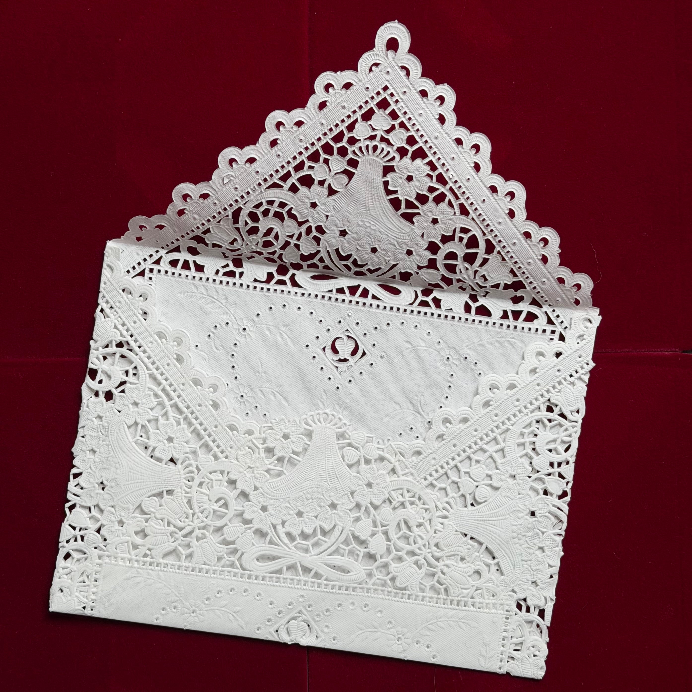 • A handwritten note tucked inside a vintage, ornate lace filigree envelope sleeve